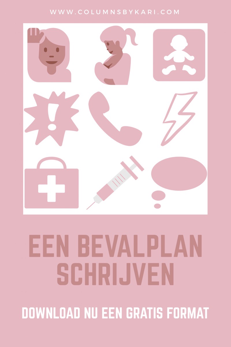 Klik hier om het format voor jouw bevalplan te downloaden. Je kunt het format helemaal invullen zoals jij wilt en aanpassen op jouw situatie, door achter ieder icoontje jouw eigen tekst te zetten. Niet zo dol op roze als ik? Print ‘m dan in zwart-wit uit.
